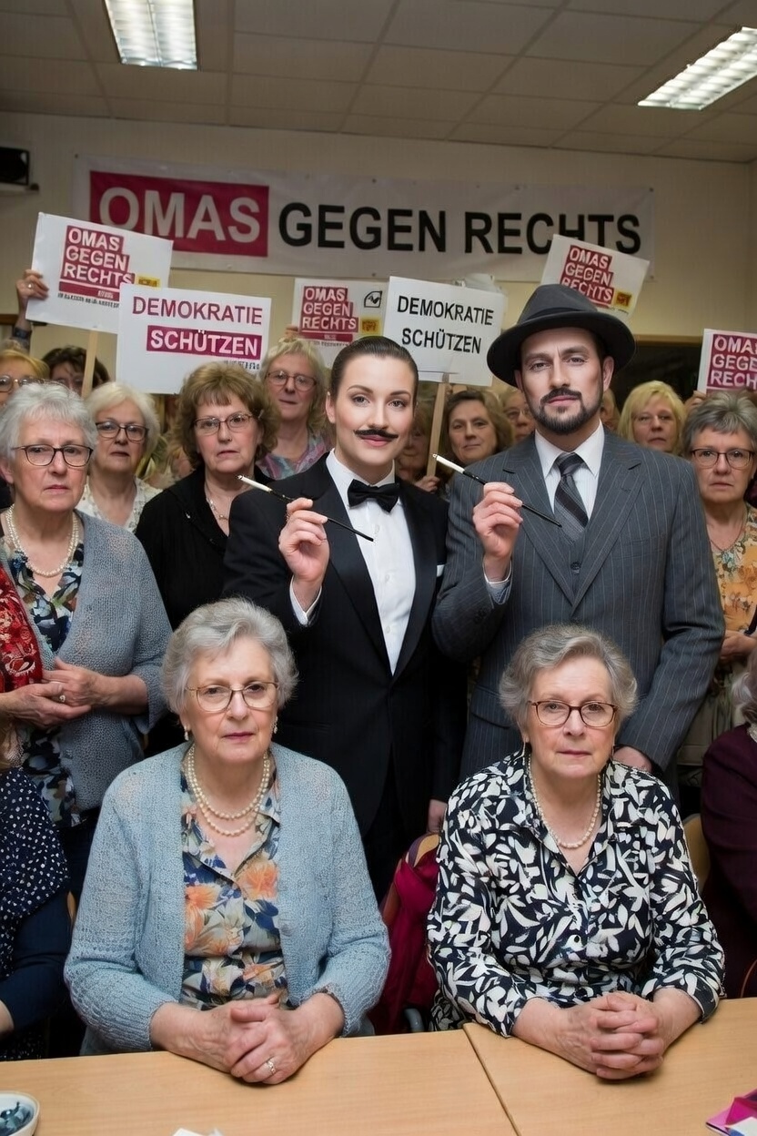 Darf ich mich kurz vorstellen? Ich bin weiblich, Ende 60 und Mutter von drei erwachsenen Kindern. Oma bin ich noch nicht, aber ich wollte auch eine Oma sein – eine Oma gegen Rechts. So ging ich zu dem ersten Ortsgruppentreffen hier im Städtchen, zu dem die Gründerin via Zeitung eingeladen hatte. Es herrschte eine gespannte Atmosphäre im Raum, der sich langsam mit alten deutschen Frauen wie mir füllte. Manche waren als Männer verkleidet und redeten auch so, aber das Selbstbestimmungsgesetz ermöglicht ja zum Glück männliche Teilhabe im Weiberspace. „So werden wir schon nicht zu übermütig mit unserer Gleichberechtigung in unserer Demokratie“, dachte ich dankbar. Eine der beiden Gründerinnen, eine Zahnarztehefrau mit tollen weißen Zähnen, begrüßte uns alle und erzählte von ihrem spannenden Vormittag in der Prosecco-Bar. Dort hatte sie die Bürgermeisterin getroffen, die Kontakt zur Antifa hatte; die Antifa wiederum ist undercover im Telegramkanal von hiesigen Querdenkern unterwegs. In diesem Telegramkanal war zu lesen, dass an diesem Tag das erste Treffen der OMG (OMAS GEGEN RECHTS) stattfinden sollte. Ein Teilnehmer hatte alle anderen aufgefordert, denen (uns) einen Besuch abzustatten.